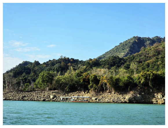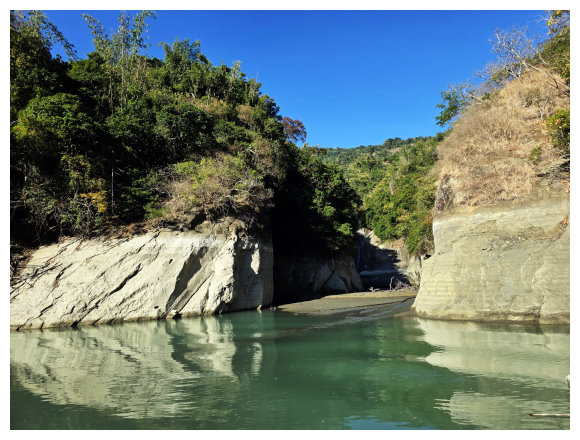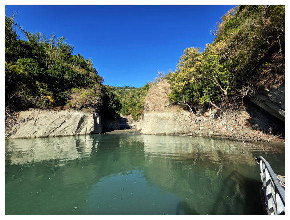 搭船遊飛鷹峽谷:據陳俊昇老鄉長說,此峽谷會形成氣旋,所以是老鷹的聚集處,遠處有座瀑布,可惜非雨季,水量不大。