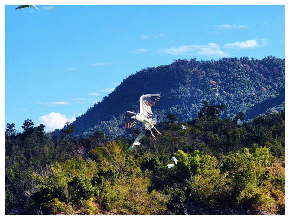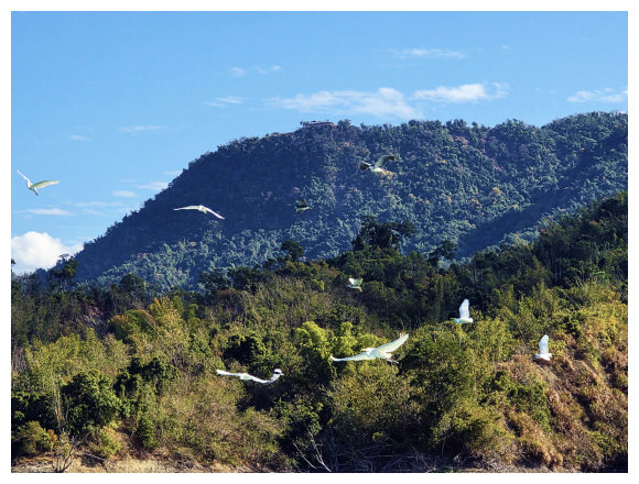 賞鷹:大埔鄉地廣人稀,空中隨時可看到大冠鳩飛翔,所以這裡的路灯是以老鷹為標誌,另外,除了水庫魚外,竹筍也是這裡的農特產品,所以路灯上也可看到竹筍的藝象。