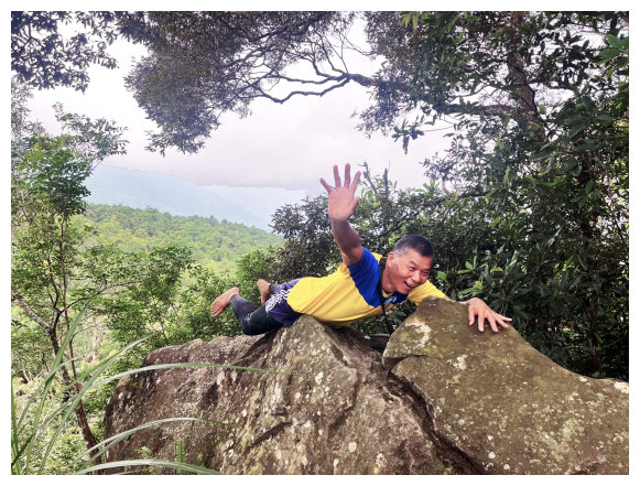 12:20 巨石拉繩上到光天高山,無基石,照相小休後原路回09:52四叉路口左下回向天湖,<光天高山救援樁>遞減。