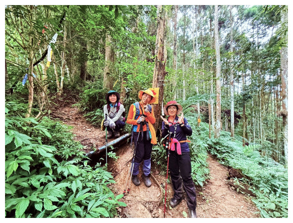 13:12 拉繩急下小溪澗再上下,光天高山這段路比較潮濕,一路可看到居民接水飲用的水管及長得很茂盛的葉類植物。