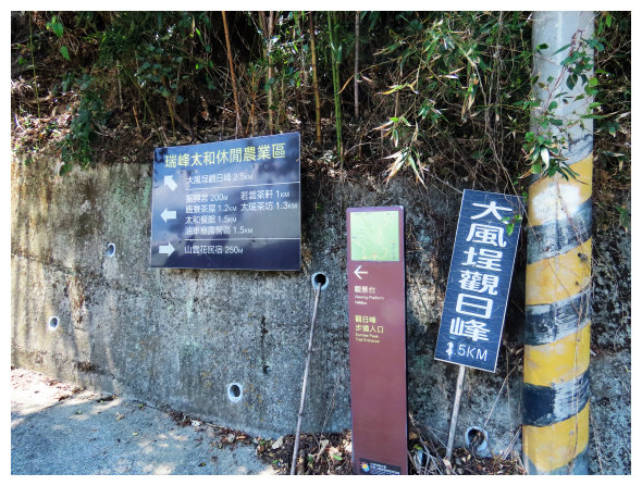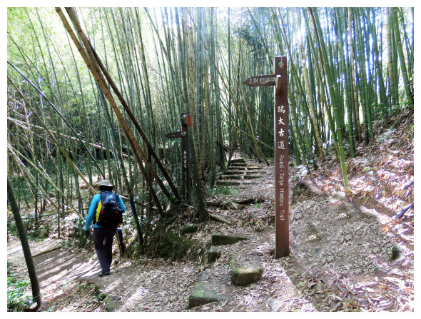 10:30 三叉路口,大路線看板,<1.3K>哩程牌,右上往奮起湖的步道已因路斷封路,取直續行瑞太古道。