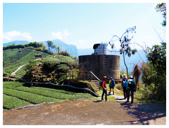 11:48 下到轉彎處的水泥圓型蓄水塔,<太和60分13西分18>電力桿,取直下的茶園階梯步道續行,三分鐘後接水泥產業道路,繼續欣賞全台最美的茶園景觀,遠遠的也可看到風埕觀日峰的涼亭。