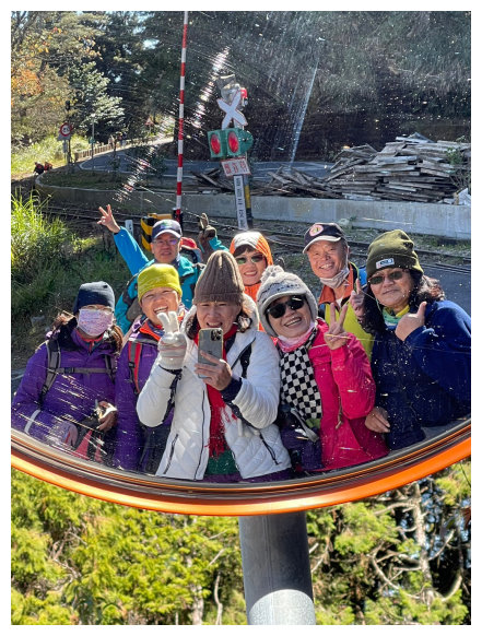 10:20 下抵祝山火車軌道的平交道。<對高岳600公尺&對高岳觀景台100公尺&祝山車站895M&小笠原山觀景台1400M>哩程指示牌及「對高岳健康登山步道導覽全圖」看板。就是一面反射鏡也能讓這群團友玩到HI。