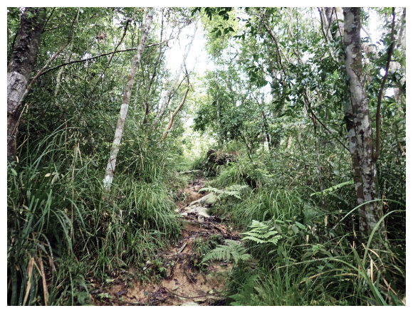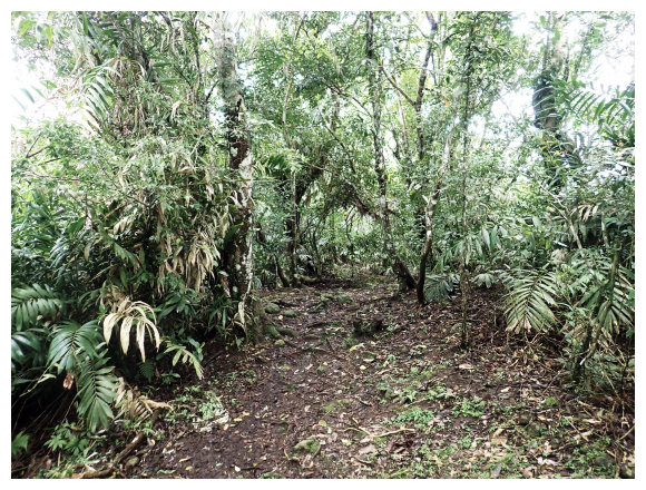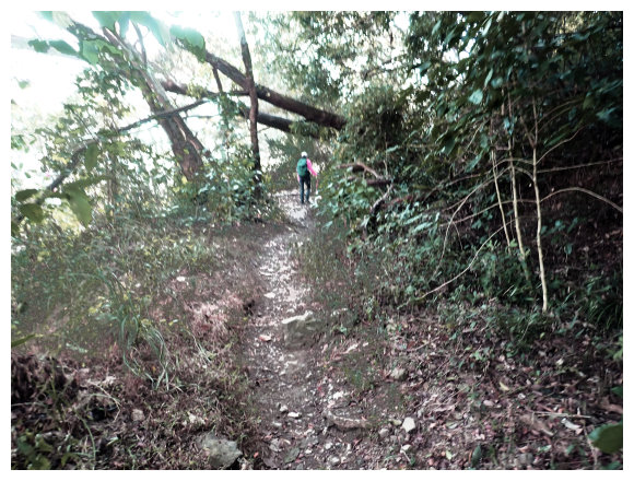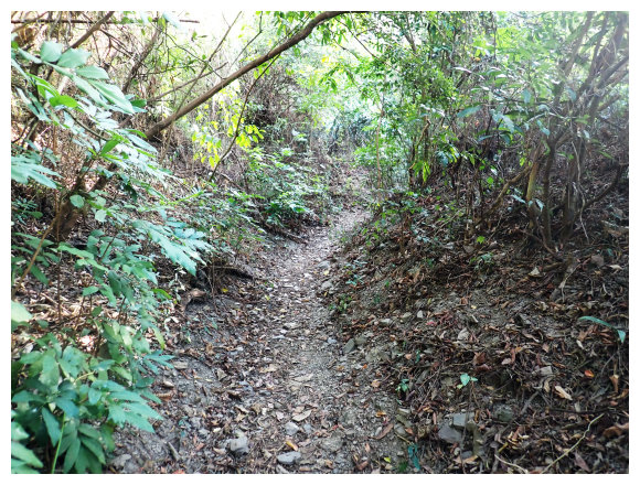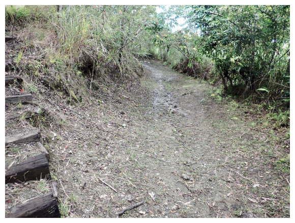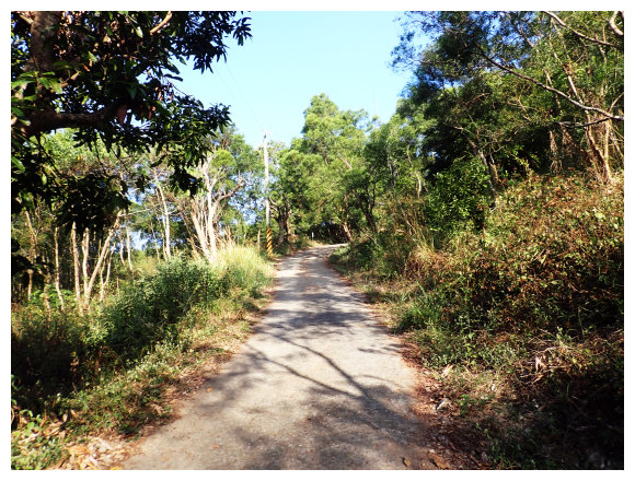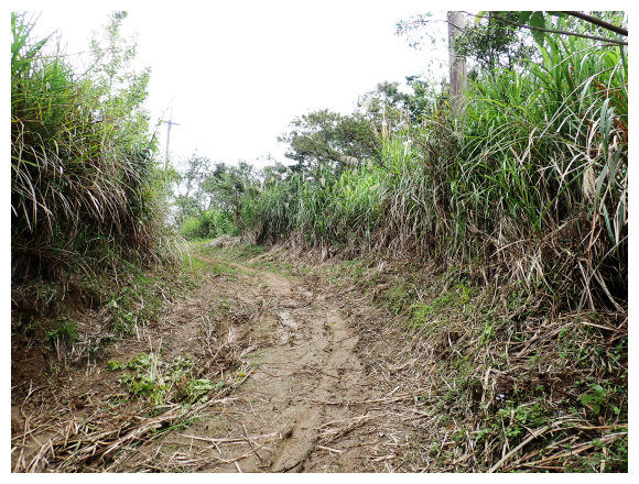 07:46 上接三叉路口,左側有水泥產業道路上一寮休息站不取,取直的土質步道續上,<一寮土雞城>指示牌。