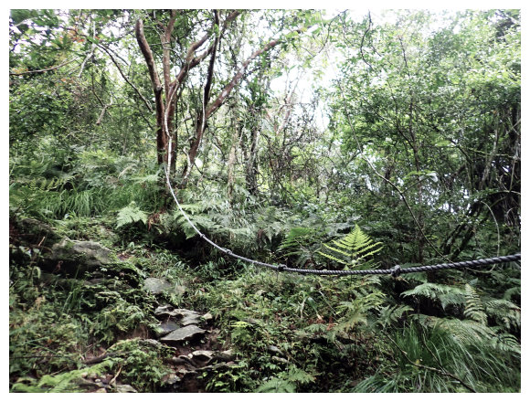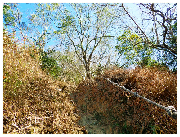 09:18 上到第三關的中途展望點,設有休息椅,(聽說天氣好的話,台灣海峽、小琉球嶼、柴山及高雄的85大樓、北大武山都可以看見,可惜今天有霧,祇好用想像的。)續上。