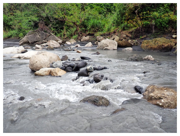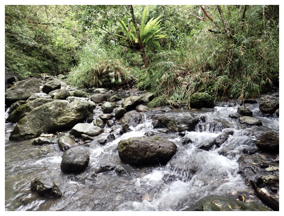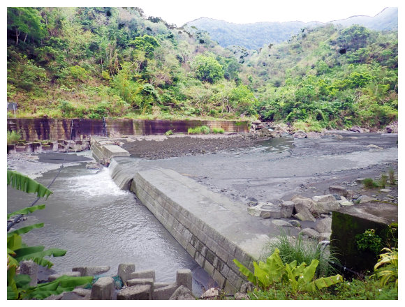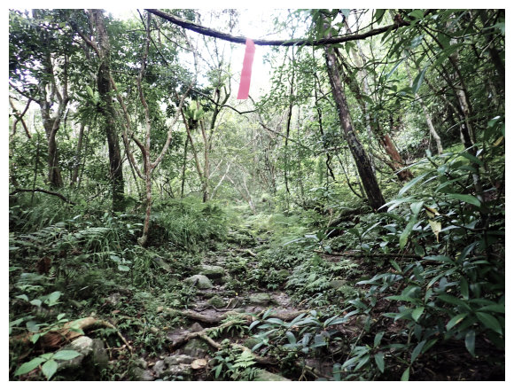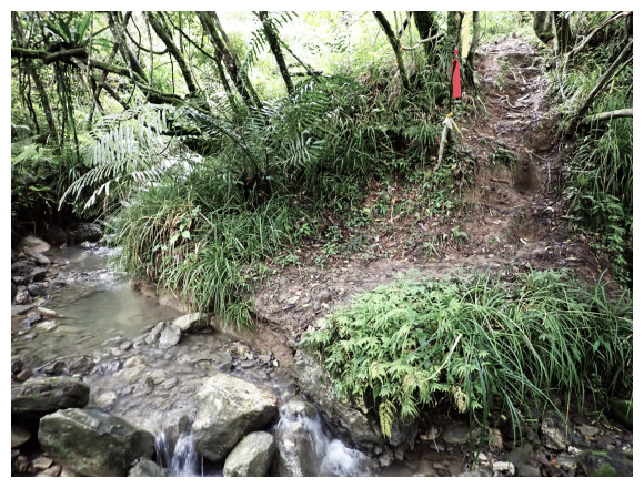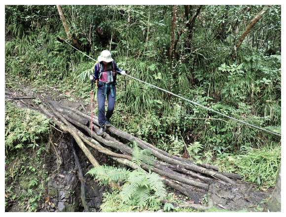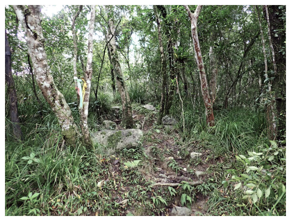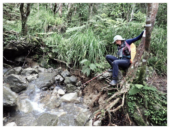 08:50 自八里灣廢棄分校出發上河堤。拉繩溯過貓公溪攔砂壩上方,(上次是沿護壁左下至崩塌地,取右側泥坡攀爬6公尺上到登山口), 這次水量比較大,取右側往上水量較緩處切過貓公溪,再回攔沙壩前的大石支流小上即順路左接回登山步徑緩上。