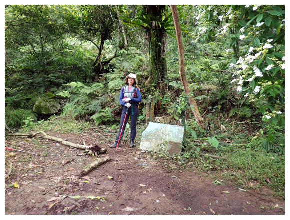 11:15 數段拉繩上抵八里灣山。三角點立在倒坍的瞭望台鐵架下,阿美族各部落尋根立碑立有許多紀念碑。右側可展望太平洋。 天雨怕貓公溪水大漲,照相後即刻順原路下山。