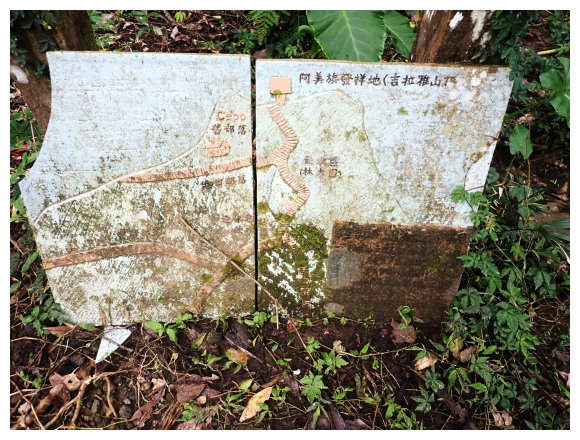 10:42 看到第二面陶燒的吉拉雅山(阿美族發祥地)地形圖,<往舊部落700M & 往發源地1200M>哩程指示牌,續上看到正前方的二座山頭,順路取左小下腰繞再上。
