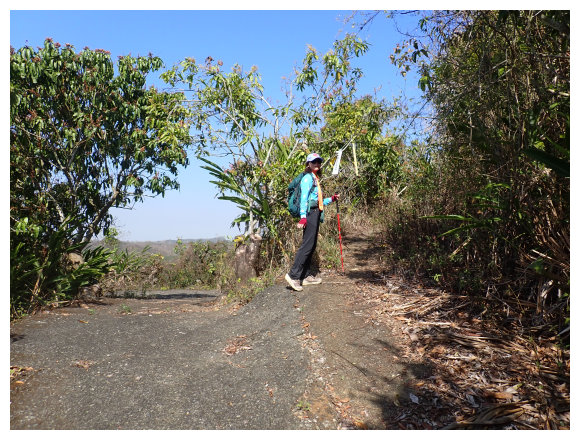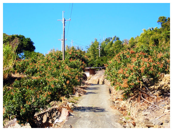 09:35 過芒果林產業道,後面仍有些民宅的三叉路口,取左側用石頭築起圍牆路走產業道路走就對了(斗六高分66右XX電桿號數累增),有陡上坡路段,偶可看見高聳的藍鳥山。
