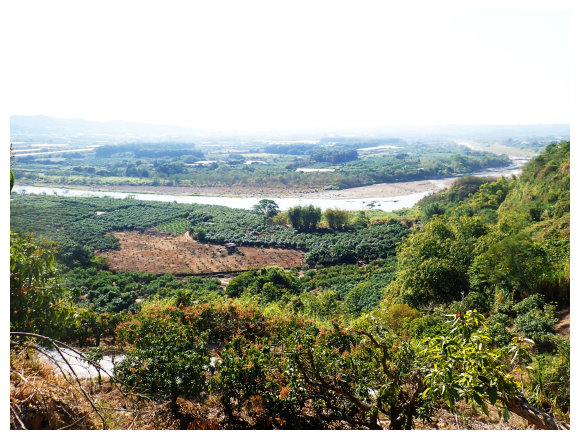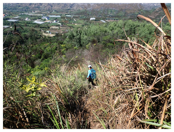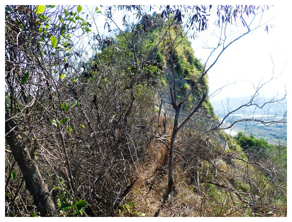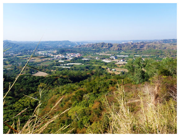 10:23 瘦稜上抵藍鳥山,右側曾文溪及玉井市區。無基石,有<南瀛百岳No.96>標示牌,是山友評為南瀛百岳最危險的一座,腹地小,但展望佳,往前走一小段可望見玉山以及中央山脈南一段與南南段,小休後原路回程。