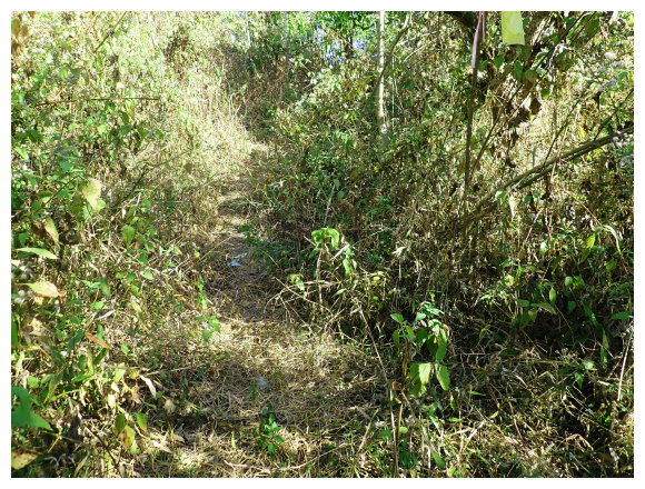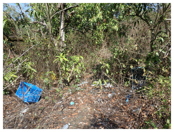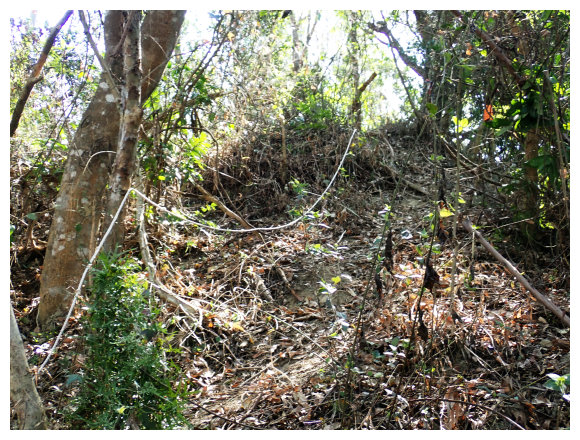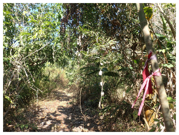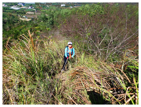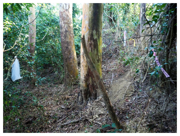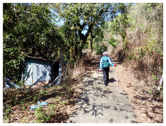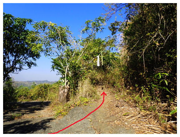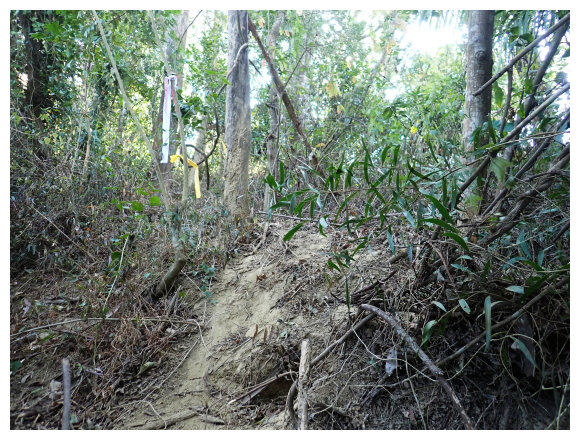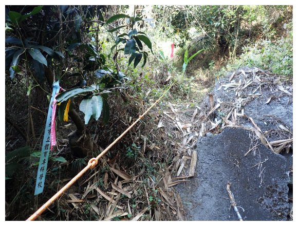 10:04 產業道路底可停數部機車,<斗六高分右31>電線桿,右上的小水泥產業道路也是登山口(有路條),順路緩上。窄水泥路盡頭,有綁新的拉繩及兩個廢棄塑膠籃,地面都是廢棄寶特瓶,加上附近山坡都有丟棄大量的套袋紙,順路上經芒果園。