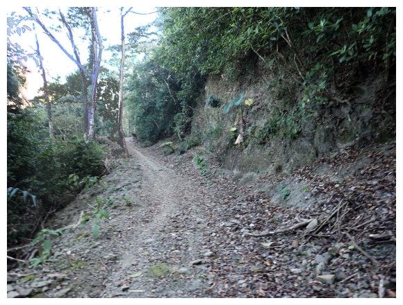 08:06 三叉路口取右續上(左往小林山、出水仔山,也可登大烏山,但較少人行走),不久產業道踏偶有出現土石路段,沿途右上方可仰望蓊鬱的西阿里關山。