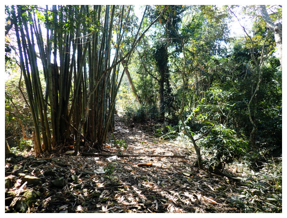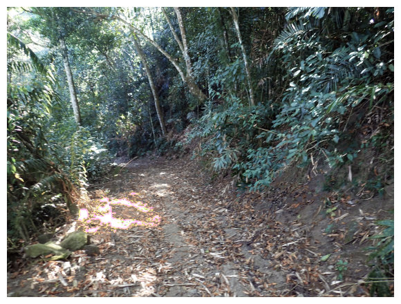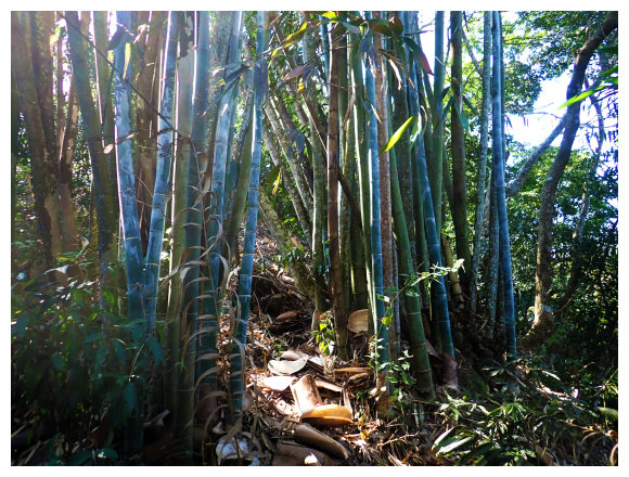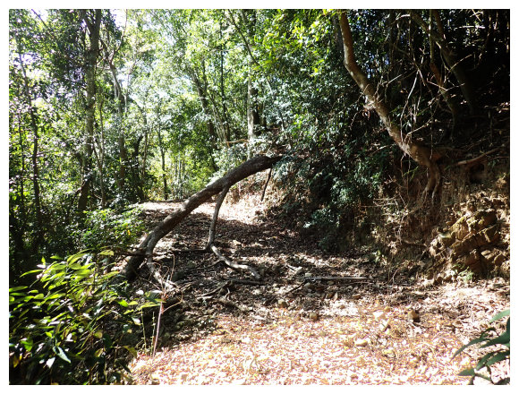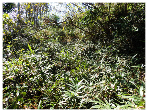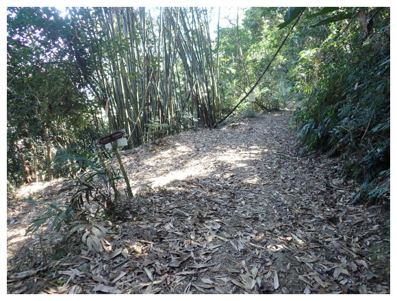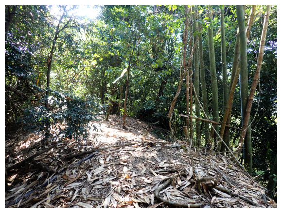 10:58 離農路右上滑斜坡,上到高點接農路,捨農路左上稜線,上稜後沿稜而上,路條可辨,偶經過粗竹欉、巨石 、黃藤區。