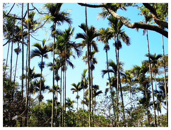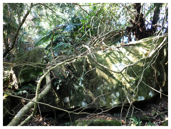 11:32 小上抵淑女峰,一顆大岩石被樹根團繞,樹幹上有南瀛百岳護貝標示牌。左前方有整園的檳榔樹及數棵超大的樹木。