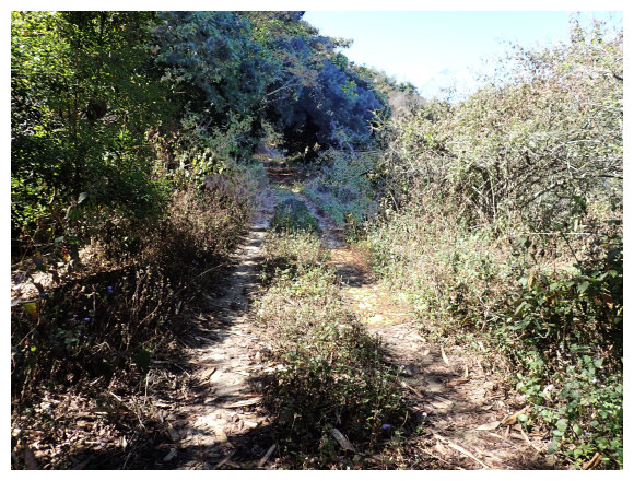 09:49 三叉路口,右前往茅山南峰經出火出南化三界𡊨(ㄊㄢ´)之西側登山口不取,取左直前的土質產道經一座的鐡門緩上到梅園,順路往稜線緩陡上。