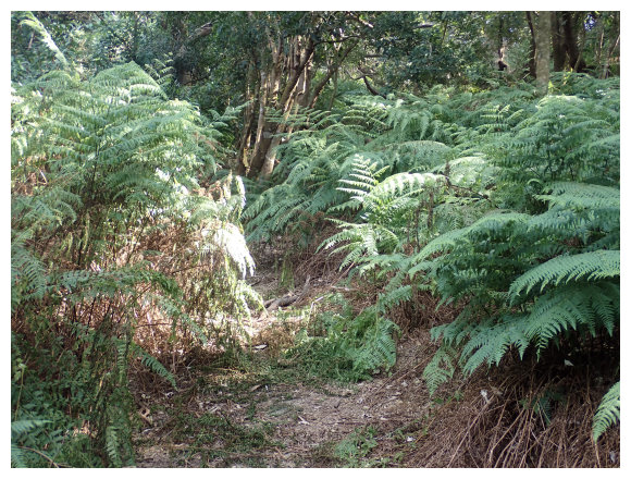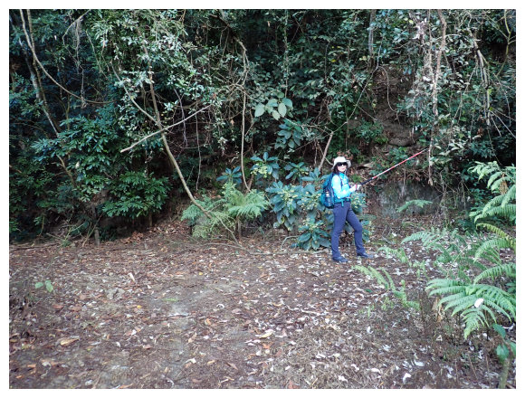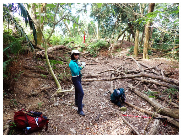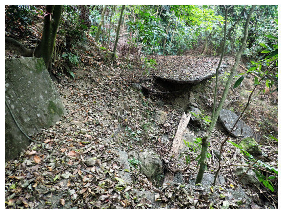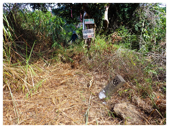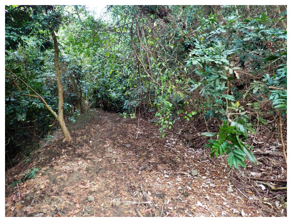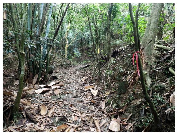 09:23 穿越小段田青路段就要離開水泥產業道路左小陡上應綁繩而未綁繩的樹林內陡坡(續行的產業道路很多斷樹不能行)。