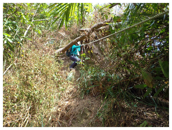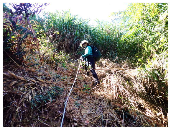 10:00 橫路頂山,休息5分鐘後,開始今天最難行的路段,多段拉繩急上下的滑土路,雨天絕不可行。