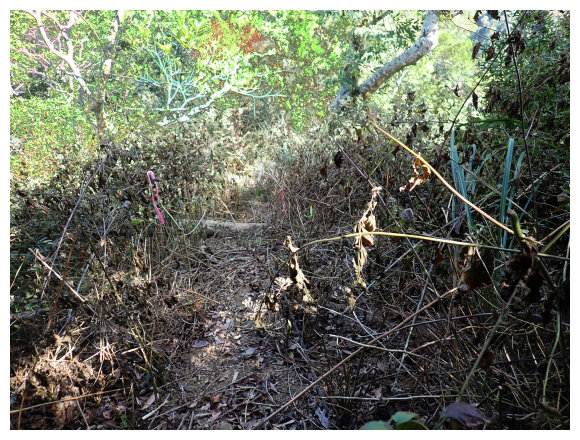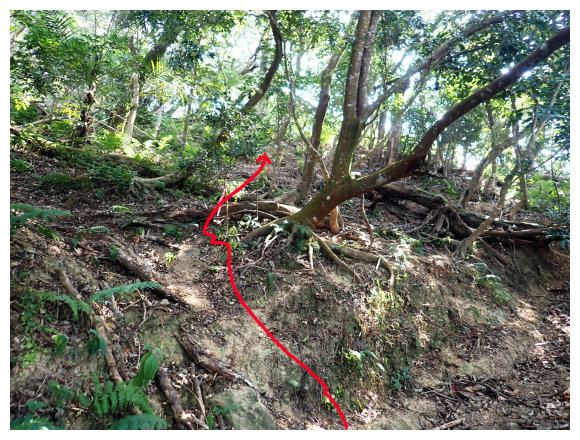 08:48 連續的坍方,順路緩上走即可接回產業道路(不可走陡上的坍路)。