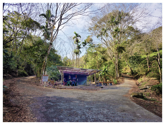08:30 梅嶺二層坪停車場(設有台南市公車停車站),下車整裝後循丁字路口右側 文川梅仔雞餐廳柏油產業道路緩上,<往觀音寺>指示牌。一路都是販賣土產的小販。