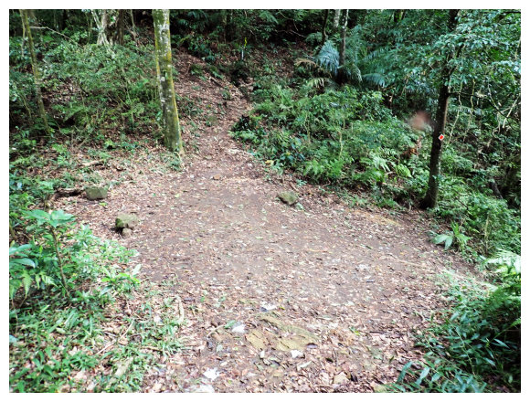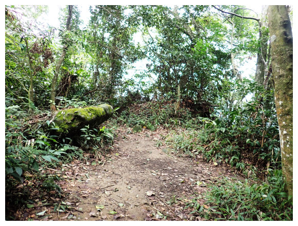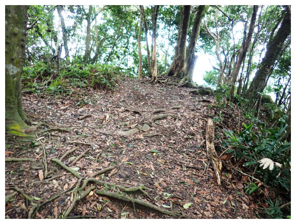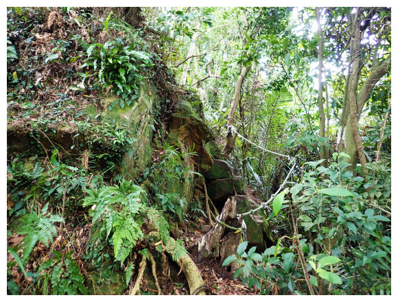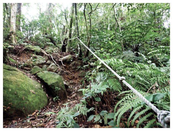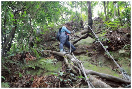 09:30 轉播天線維護房(大溪鎮金山路392巷280號,<美華分線150>電力桿。小休後小上即接稜線上的步道(左往金山面山 不取,取右往金面山)。順步道取直右上。過轉播天線維護房上方稜線過轉播天線後續行。之後就是順著稜線小上小下的步徑,稍行即可從右側樹隙間看見大溪市景,小攀地形都有拉繩或樹根可確保。