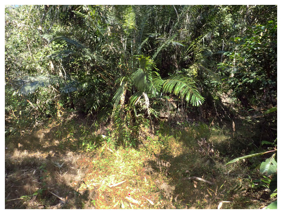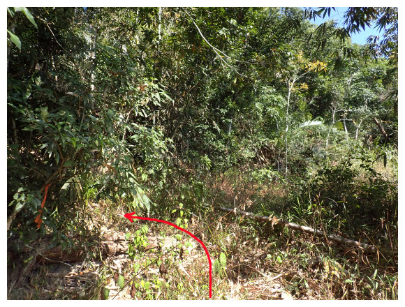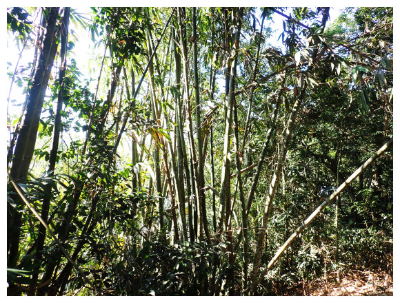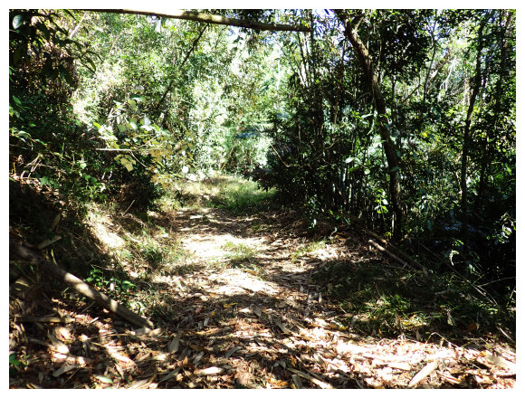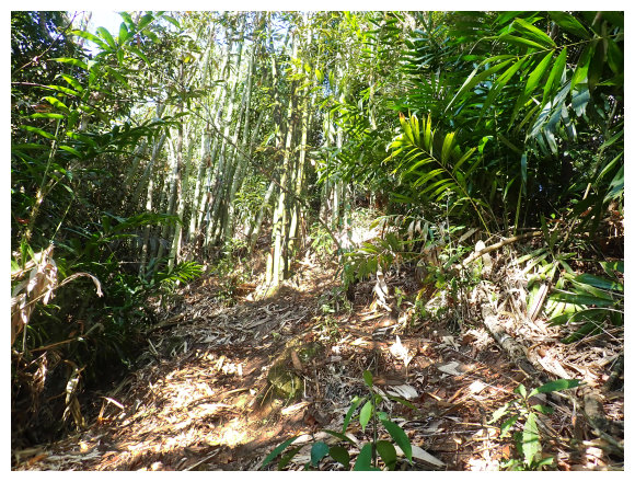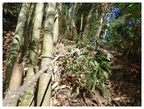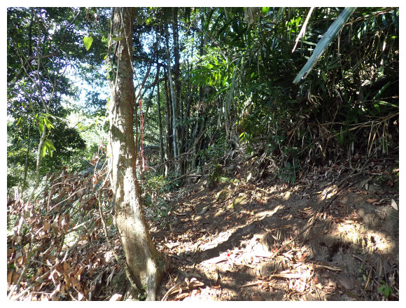 小行一分鐘林道終止點即是登山口,右拉繩緩陡上竹林。