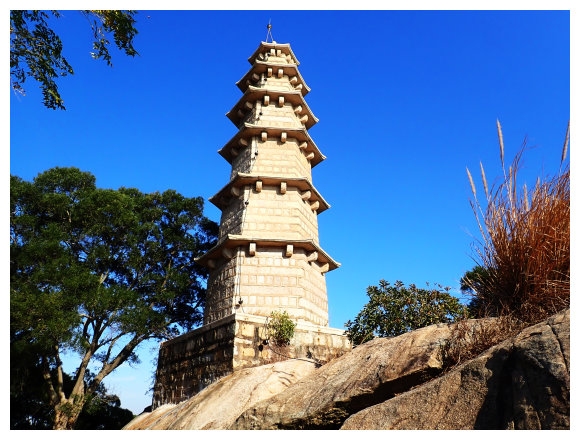 文台寶塔:位於古城村金門城南磐山南端,建於明朝洪武20年,也就是西元1387年時,以花崗岩石條而砌成的的五層六角形實心塔,塔頂有鐫字及浮刻的花樣,而塔下盤石則有明朝陳揮於萬曆35年(西元1607年)手書墨蹟,以及近人張大千大師墨寶,塔型規模雖小,卻相當別緻且頗值玩味,現在已經被列為國家二級古蹟。