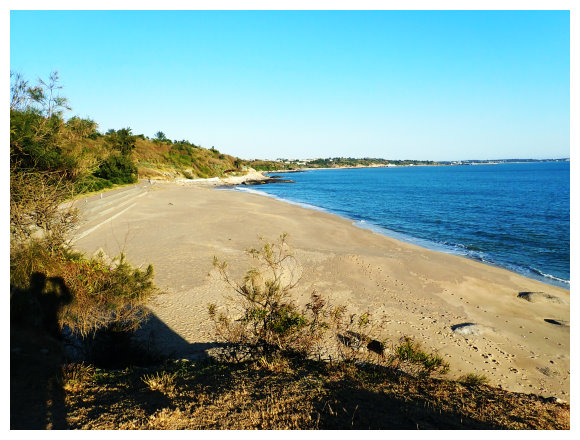 金門料羅海濱公園:位於料羅灣之前,以擁有一段潔白的海岸沙聞名,但不知沙岸是否埋有地雷,居然看不到戲水人潮。想想金門砲戰時,國軍補給都靠料羅彎搶灘運補,當初這個海岸線在中共砲火轟擊下甚為激烈。如今整建有涼亭、步道防風林等設施,也是一處值得來的遊憩地。.