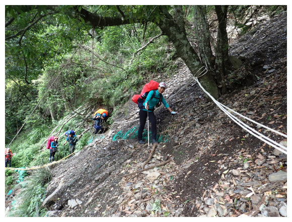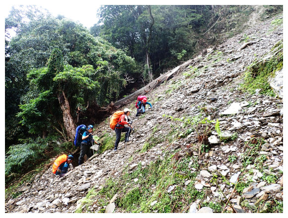 13:32 11.6K大坍方區,原鋼管橋已摔落至下方,管理單位設有拉繩供通行,但步道僅一鞋寬度,碎石鬆弛,僅能一個個通過,耗了不少時間。