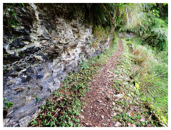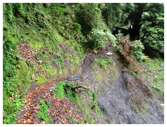 14:00 舊大坍方區(11.8K),原舊路下切路段已垮,立有鋼條阻擋,取左小上即拉繩拉鐡錬接回舊古道,續行不久即見<12K>哩程牌。