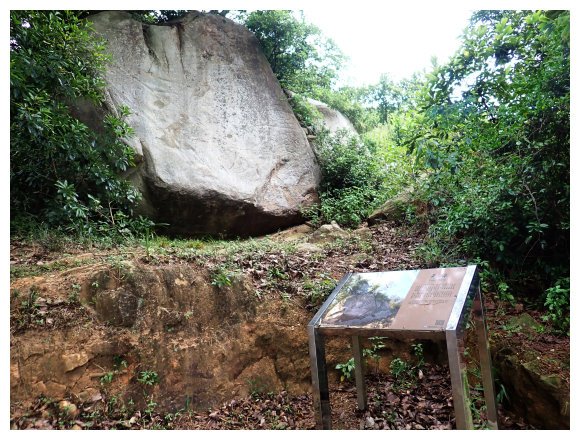 碑文已模糊的巨石,一旁有碑文的解說牌。