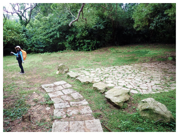 10:10 看到上方的倒影塔,斗門古道上方終點就到了,<0K+994M>哩程牌,這裡是鄭成功奕棋處,有「倒影塔、古石室」 景觀點。上到觀景台處休息10分鐘再順玉章路下山。