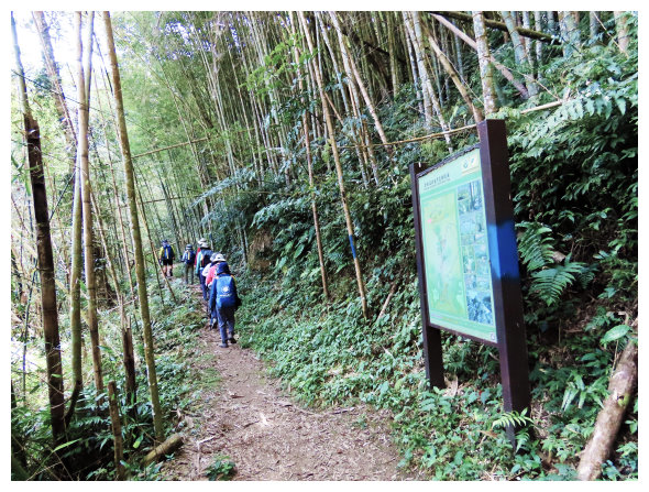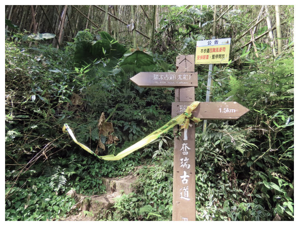 10:30 三叉路口,大路線看板,<1.3K>哩程牌,右上往奮起湖的步道已因路斷封路,取直續行瑞太古道。