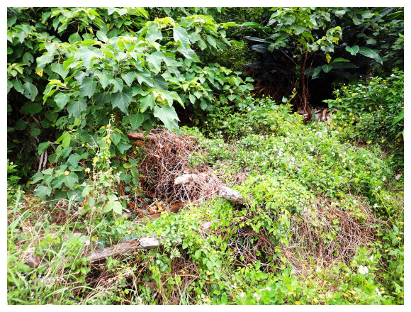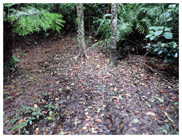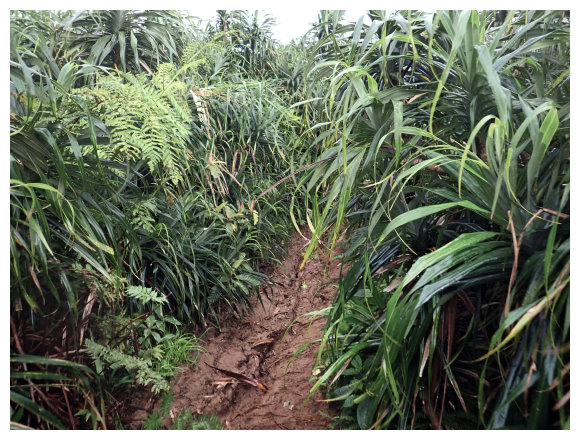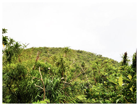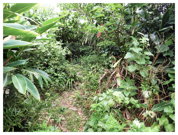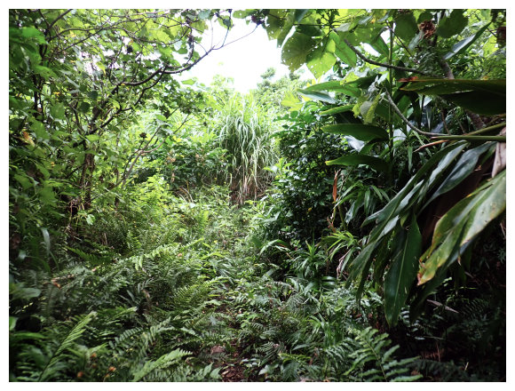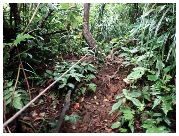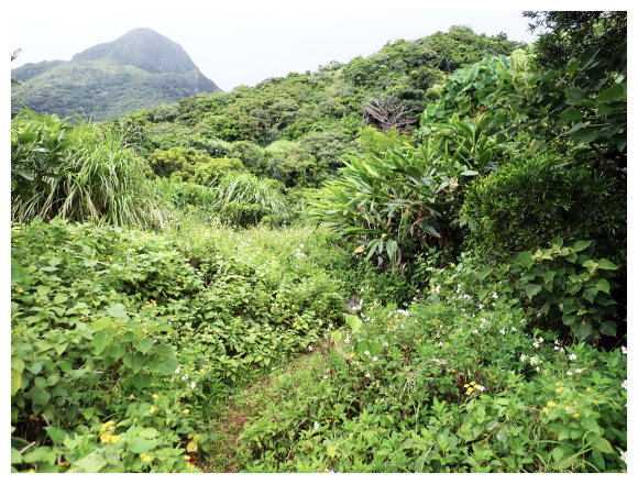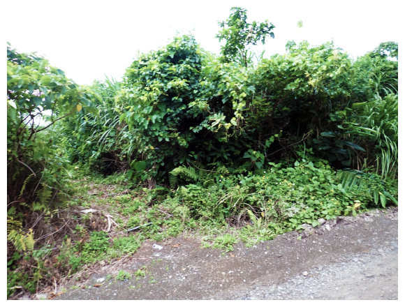 06:33 產業道路終點。右側有棵拔拉樹,右側有間倒塌的蘭嶼特有小屋,左側原本是芋田,這次前來已荒廢了,小行見右側步徑綁有路條,順登山小徑緩。