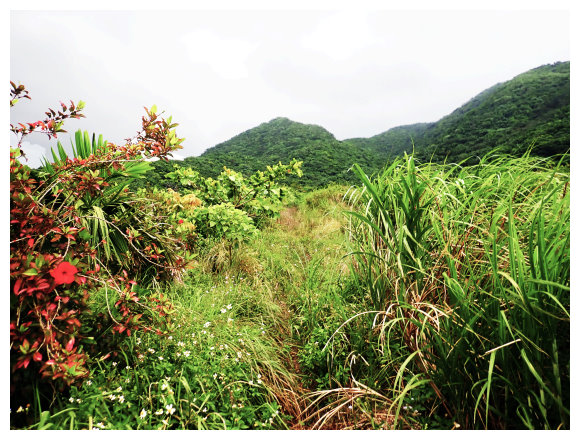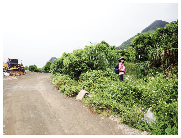06:26 自來水廠圍牆轉角處,右上長滿雜草的紅頭山登山步徑,路上可回望太平洋及椰油部落及太平洋海岸線上的饅頭山,也可欣賞左上方的相愛山。