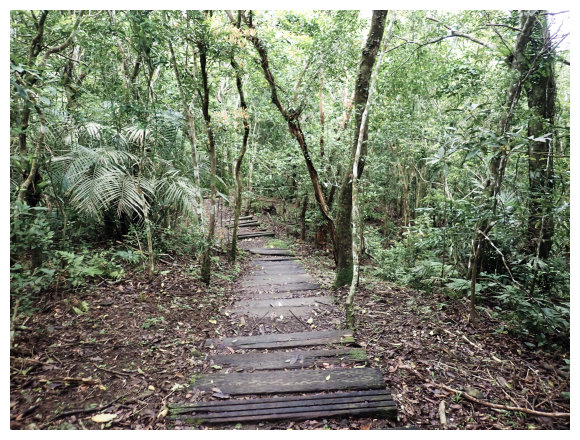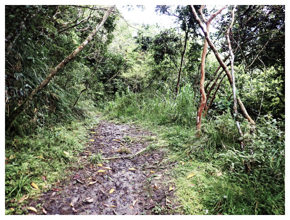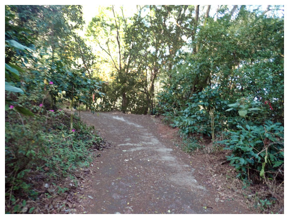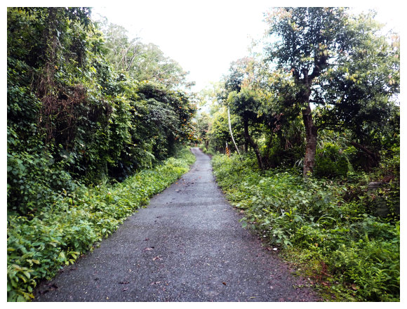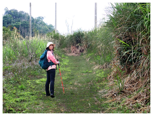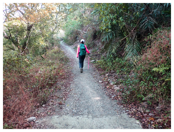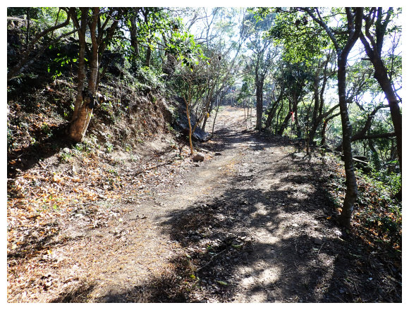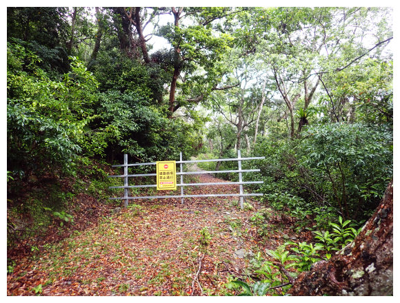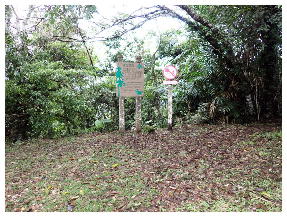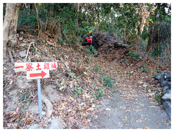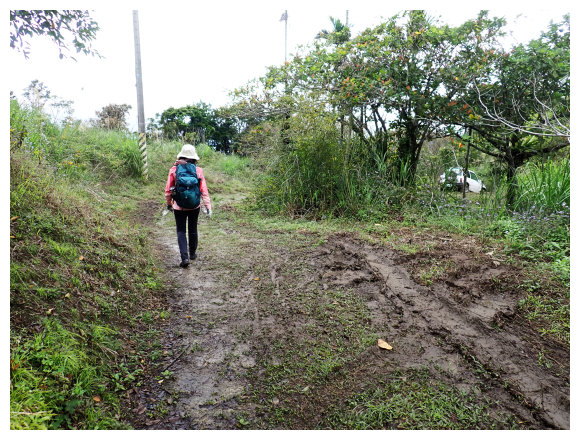 07:46 上接三叉路口,左側有水泥產業道路上一寮休息站不取,取直的土質步道續上,<一寮土雞城>指示牌。