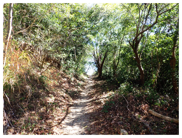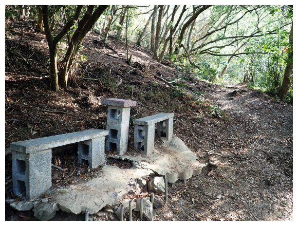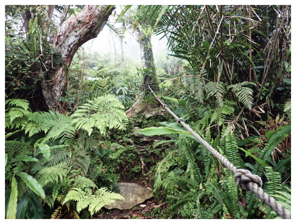 09:18 上到第三關的中途展望點,設有休息椅,(聽說天氣好的話,台灣海峽、小琉球嶼、柴山及高雄的85大樓、北大武山都可以看見,可惜今天有霧,祇好用想像的。)續上。