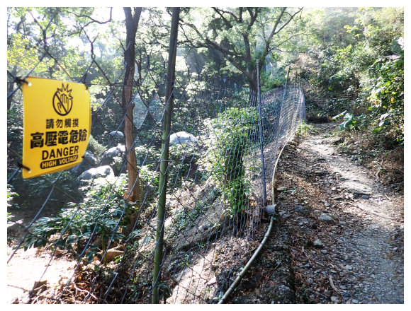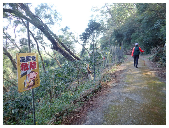 08:46 又見有電網的咖啡園即到<第一關起登入口處/H695M>指示牌的路徑,順土質步道緩上。