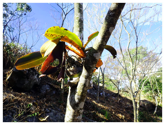 09:03 上到高點,有休息椅,小休後順路小下接產業道路緩上,每棵樹桿上都種植有各式的蘭花。
