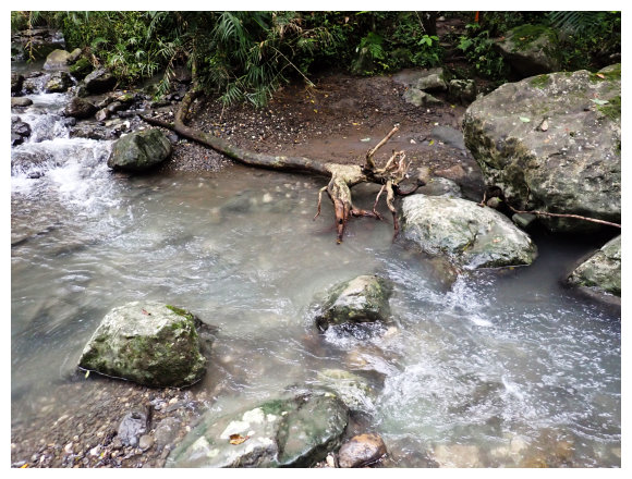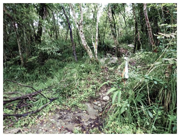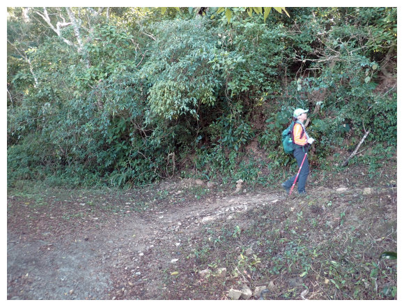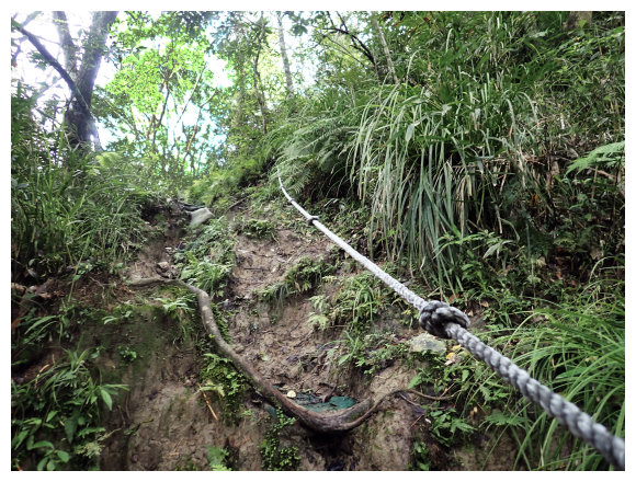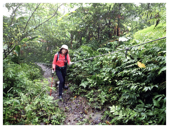 08:50 自八里灣廢棄分校出發上河堤。拉繩溯過貓公溪攔砂壩上方,(上次是沿護壁左下至崩塌地,取右側泥坡攀爬6公尺上到登山口), 這次水量比較大,取右側往上水量較緩處切過貓公溪,再回攔沙壩前的大石支流小上即順路左接回登山步徑緩上。