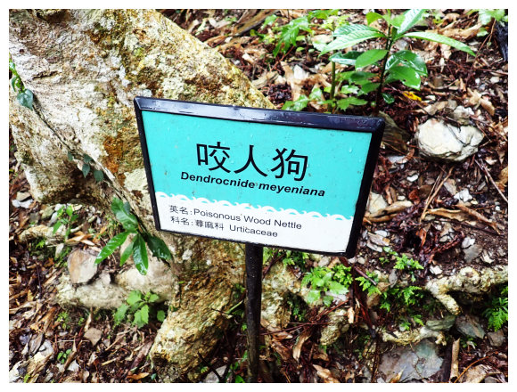 13:09 下到七里香步道岔路口,取右下七里香步道,小行即見到一棵咬人狗樹,樹皮上有白痕不能碰,否則就像會有像被咬人貓咬的疼痛。