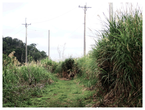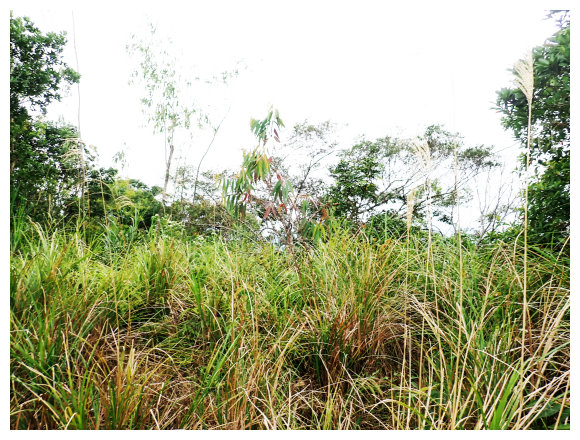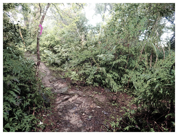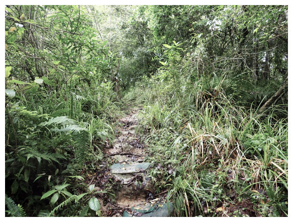 08:50 上抵一處長滿野草的荒田,左側有座工寮,順路續上,關始有路條出現了,三分鐘後路過千根榕。