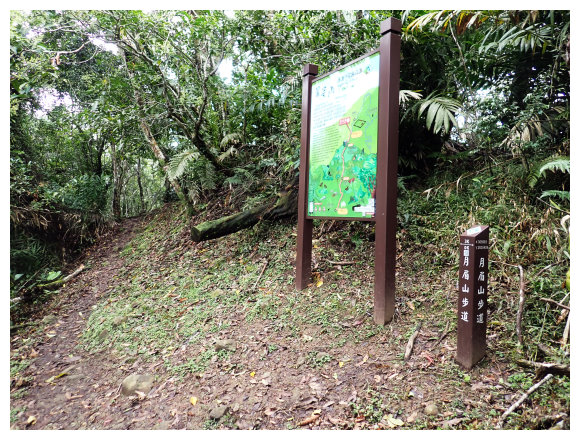 12:22 產業道路終點,有塊『綠色宣言』解說牌,取右林道小行即看到了月眉山步道導覽圖及<月眉步道3K/0K>哩程樁。