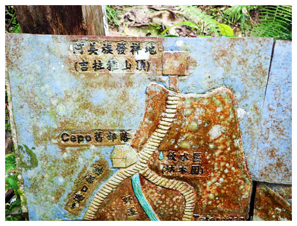 10:42 看到第二面陶燒的吉拉雅山(阿美族發祥地)地形圖,<往舊部落700M & 往發源地1200M>哩程指示牌,續上看到正前方的二座山頭,順路取左小下腰繞再上。