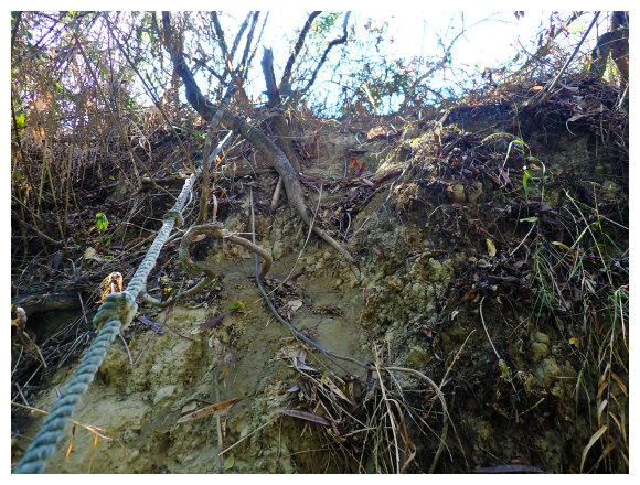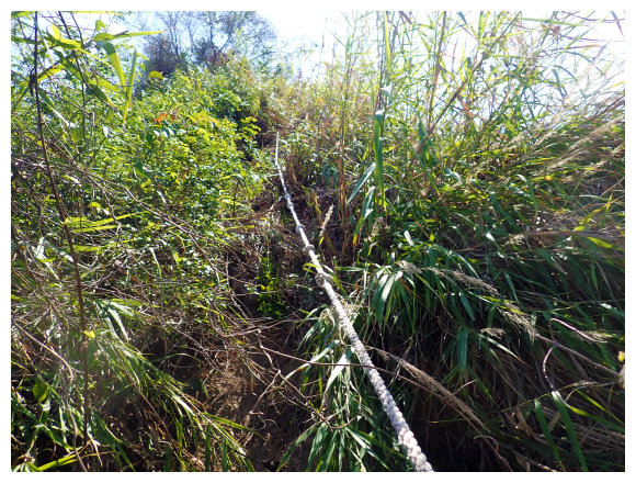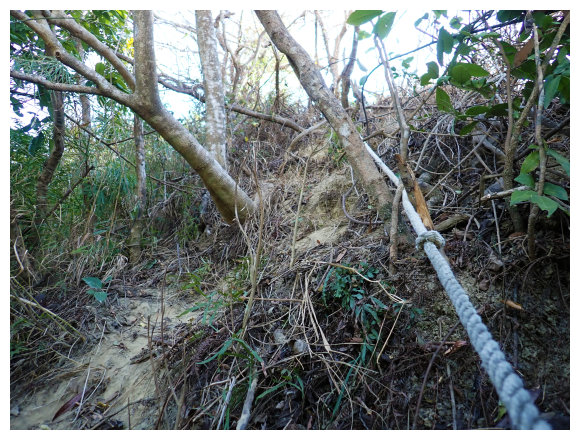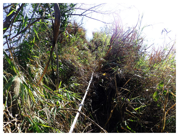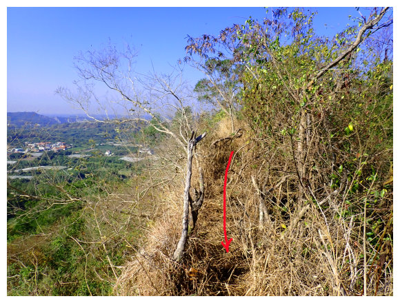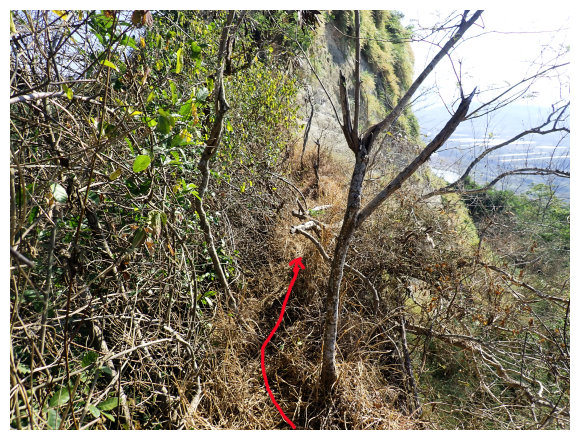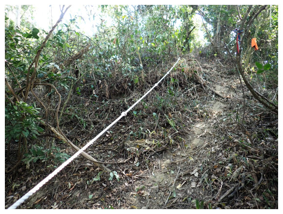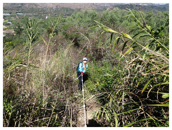 10:04 產業道路底可停數部機車,<斗六高分右31>電線桿,右上的小水泥產業道路也是登山口(有路條),順路緩上。窄水泥路盡頭,有綁新的拉繩及兩個廢棄塑膠籃,地面都是廢棄寶特瓶,加上附近山坡都有丟棄大量的套袋紙,順路上經芒果園。