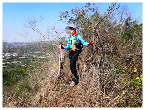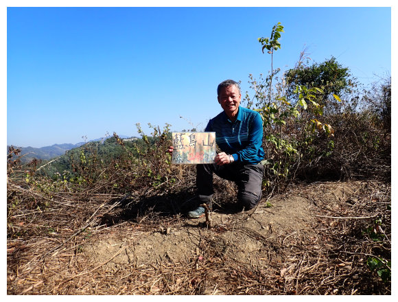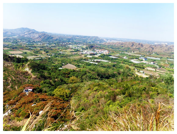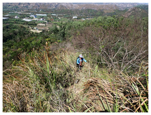 10:23 瘦稜上抵藍鳥山,右側曾文溪及玉井市區。無基石,有<南瀛百岳No.96>標示牌,是山友評為南瀛百岳最危險的一座,腹地小,但展望佳,往前走一小段可望見玉山以及中央山脈南一段與南南段,小休後原路回程。
