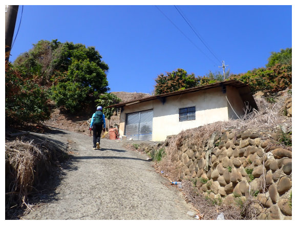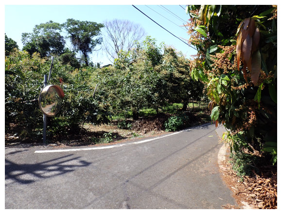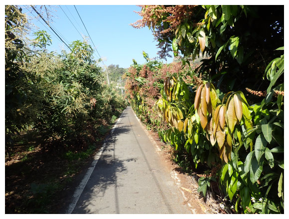 09:30 步行取左進入村落住宅區。3分鐘抵三叉路口取左小行3公尺即取右走一車寬度的芒果林產業道路(三叉路口左側民宅偶遇賣超大的棗子/玉井區中正114-2號民宅)。