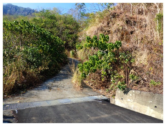 08:06 三叉路口取右續上(左往小林山、出水仔山,也可登大烏山,但較少人行走),不久產業道踏偶有出現土石路段,沿途右上方可仰望蓊鬱的西阿里關山。