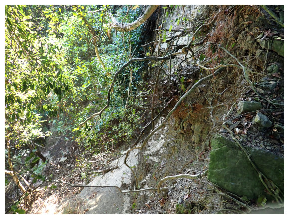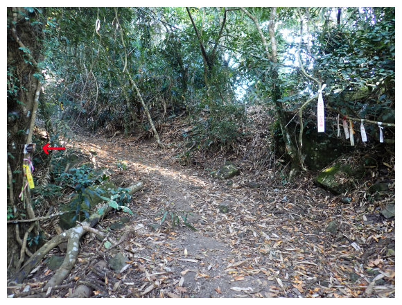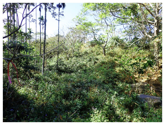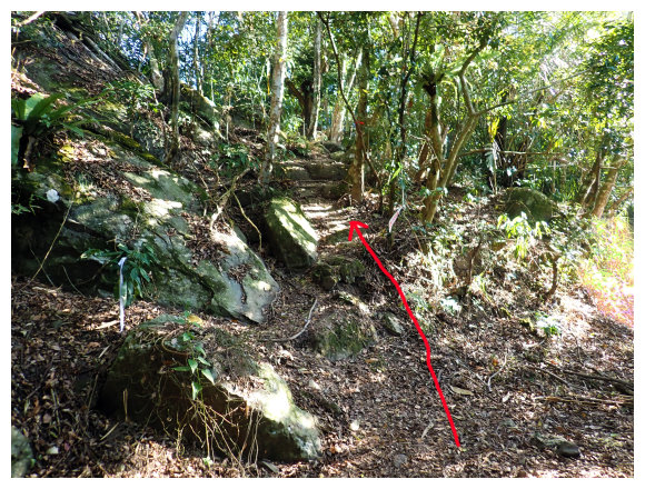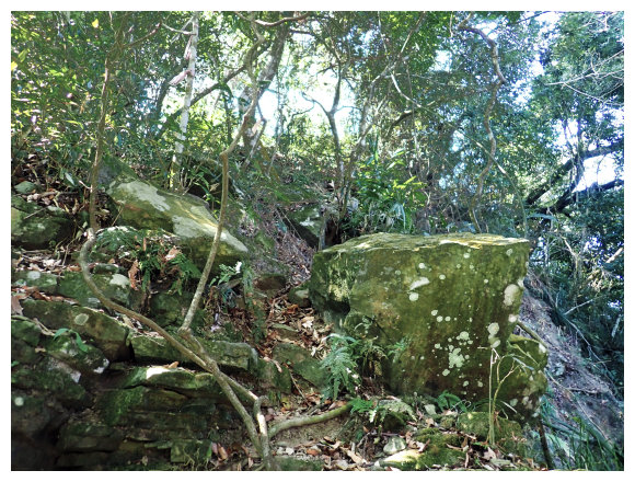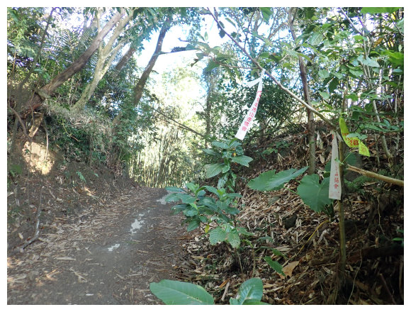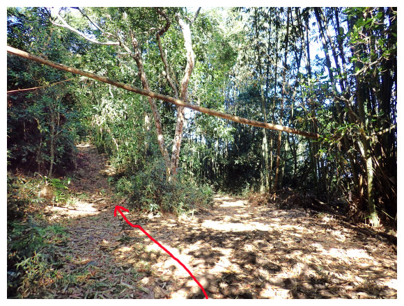 11:13 左崩坍地,有小拉繩上岩石路徑不取,取右綁上布條,旋上接回步道。