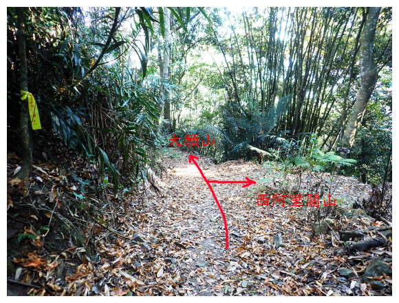 09:00 越嶺後下行抵三叉踏口,直下往大願山暫不取,右上往西阿里關山續行,<左往南化端登山口,右往西阿里關山>指示牌。,也是等一下要往大願山的路。先取右上產道往西阿里關山。
