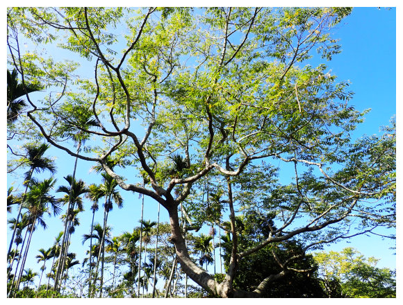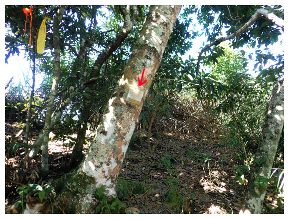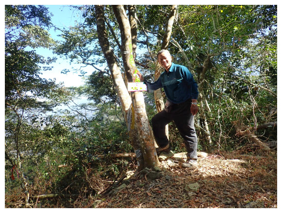 11:32 小上抵淑女峰,一顆大岩石被樹根團繞,樹幹上有南瀛百岳護貝標示牌。左前方有整園的檳榔樹及數棵超大的樹木。